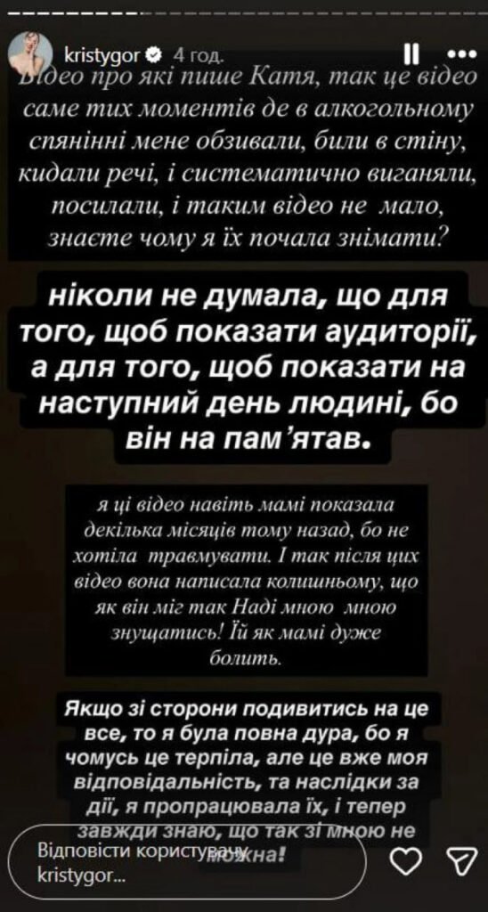 Мене могли послати 300 разів, а вранці повзати на колінах з вибаченнями. Я маю відео, де мене обзивали, били в стіну, кидали речі й виганяли з дому, – зізналася Христина.
