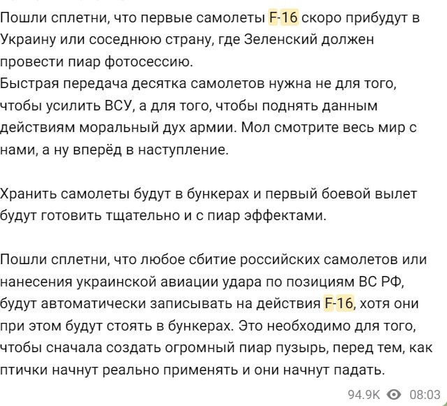 – Це просто піар. F-16 не будуть використовувати на фронті! – вигадують пропагандисти, намагаючись заспокоїти своїх послідовників. Хоча всі розуміють, що це лише спроба приховати страх.