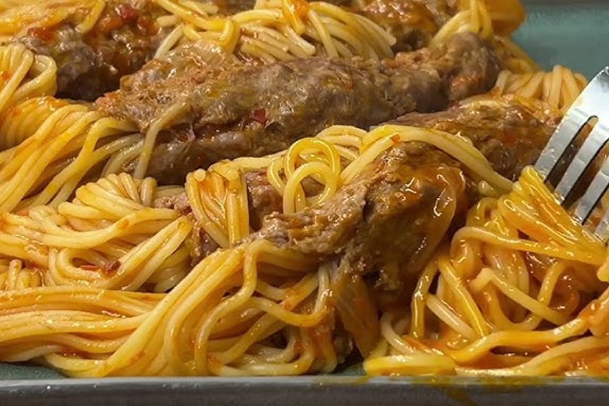 Соус – головна родзинка. На сковороді обсмажте подрібнену цибулю та моркву, додайте томатну пасту, сметану, спеції й трохи рідини. Консистенція має бути кремовою – тоді спагеті та курка вберуть у себе аромат і залишаться соковитими.
