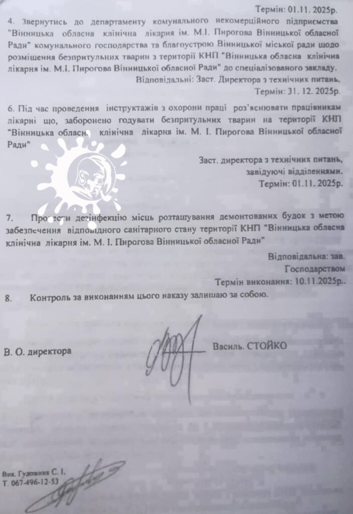 Поки зразки тканин прямують до лабораторії, у Вінниці продовжують виринати документи, що проливають світло на організацію процесу. Наказ №4 та №7, підписані В.О. директора Василем Стойком, чітко вказують на терміни “зачистки” території від безпритульних тварин – до листопада та грудня 2025 року.