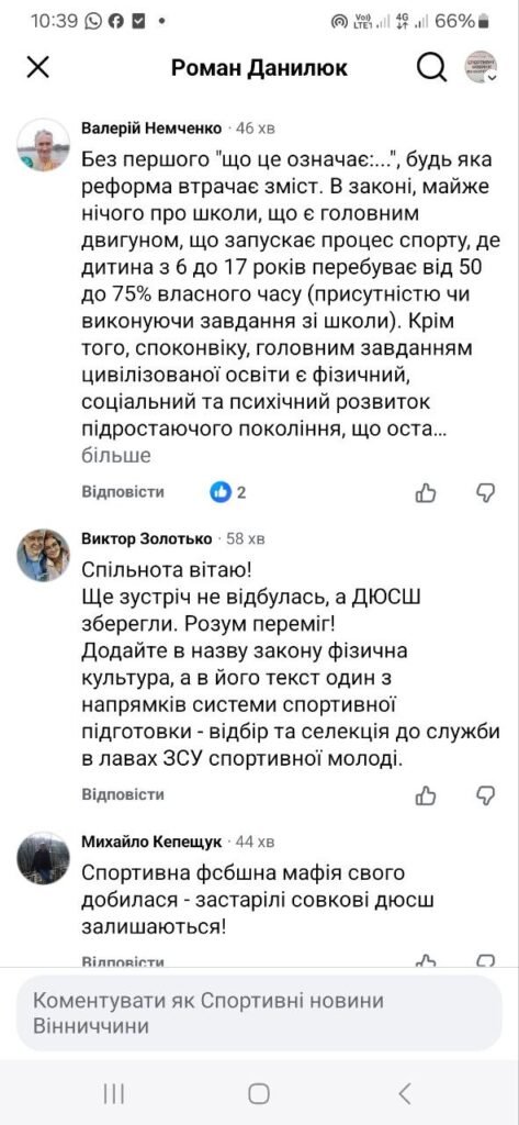 Спільнота, вітаю! Ще зустріч не відбулася, а ДЮСШ зберегли. Розум переміг! Додайте в назву закону «Фізична культура», а у його текст одним із напрямків системи спортивної підготовки – відбір та селекцію до служби в лавах ЗСУ спортивної молоді, – радіє Віктор Золотько.