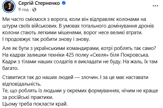 Ми часто сміємося з ворога, коли він відправляє колонами на штурм своїх військових. В умовах тотального домінування дронів колони стають легкими мішенями, ворог зазнає великих втрат. І продовжує так робити знову і знову. Але як бути з українськими командирами, котрі роблять так само?, – публічно запитує Стерненко.