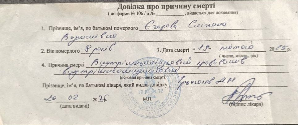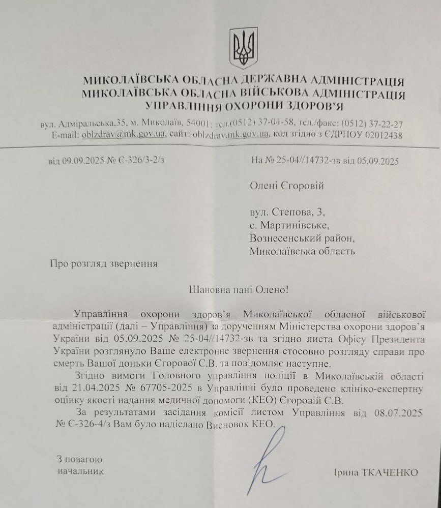 Попри звернення до Офісу Президента та МОЗ, перша клініко-експертна оцінка (КЕО) у Миколаєві, проведена у липні 2025 року, не визнала провини лікарів. Це стало шоком для родини, адже висновок про смерть чітко вказує причину – крововилив, який вимагав негайного втручання.