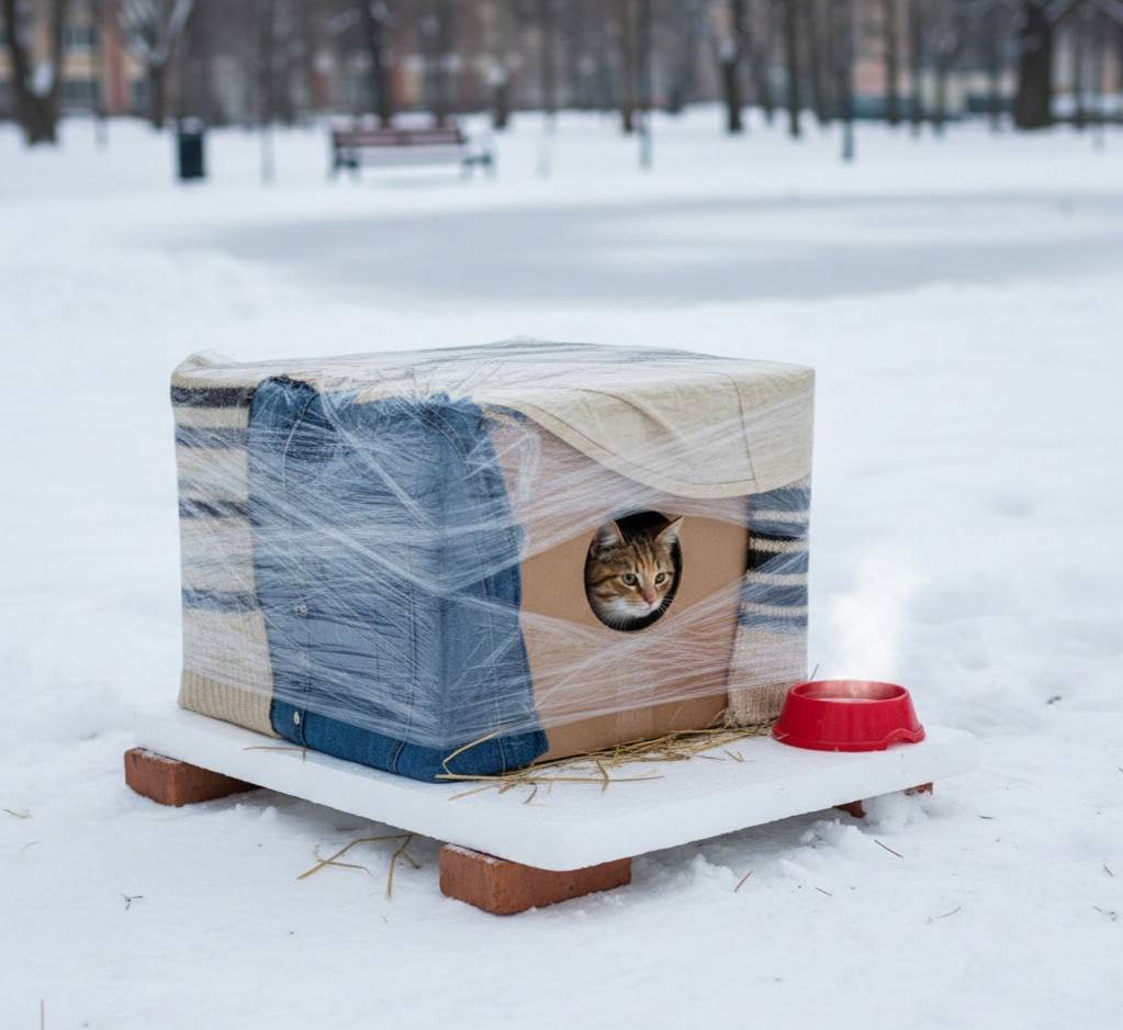 Найпростіший варіант – картонна коробка. Але важливо правильно її підготувати. Зовні коробку варто щільно обмотати непотрібною футболкою, старою кофтою або простирадлом. Це створює додатковий повітряний прошарок, який утримує тепло. Усередині обов’язково має бути суха підстилка: фліс, старі рушники, плед або солома. Підстилка повинна бути чистою і сухою – саме це є ключовою умовою.